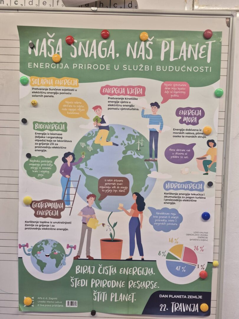 Povodom Dana planeta Zemlje naši su učenici sudjelovali u brojnim aktivnostima. Iako su aktivnosti bile raznovrsne, sve su imale isti cilj – osvijestiti učenike o važnosti čuvanja našega planeta Zemlje, o isticanju dobrobiti i mogućnosti koje nam pruža, naglašavajući pritom na koje sve načine ljudi mogu naštetiti Zemlji, ali još važnije provodeći u djelo male korake za očuvanje iste. Tako se je razredna nastava iskušala u crtanju čiste i onečišćene Zemlje, izradi prigodnih plakata, sudjelovanje na radionici o onečišćenosti mora, o reciklaži otpadaka od hrane. Također, brojni su učenici sudjelovali i u eko akciji čišćenja obale uz more te su vrijedno napunili nekoliko desetaka vreća punih smeća! Peti su razredi sudjelovali na kvizu povodom Dana planeta Zemlje u organizaciji OŠ Dobrile. Osim navedenog, učenici koji pohađaju Građanski odgoj i obrazovanje osmislili su anketu za učenike predmetne nastave s kojom su htjeli ispitati upoznatost učenika s onečišćenjem mora, anketa je još u tijeku te željno iščekujemo njezine rezultate! Imajmo na umu koliko je Zemlja vrijedna i koliko zapravo svatko od nas može učiniti da ju očuva, ponekad su to samo sitnice koje znače blistaviju budućnost!