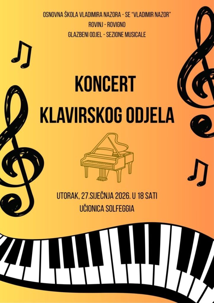 Pozivamo vas da nas podržite na koncertu Klavirskog odjela na kojem će naši vrijedni učenici pokazati svoje vještine i znanje koje su stekli tijekom ove nastavne godine.