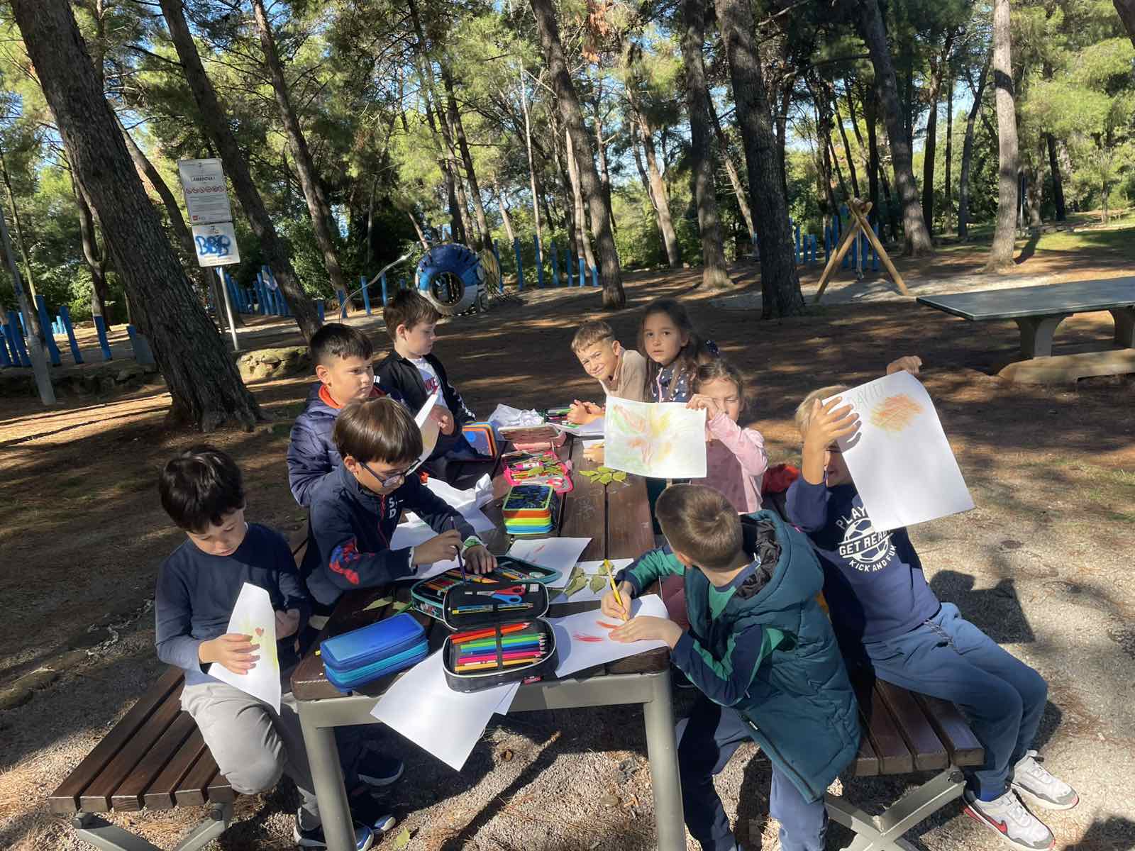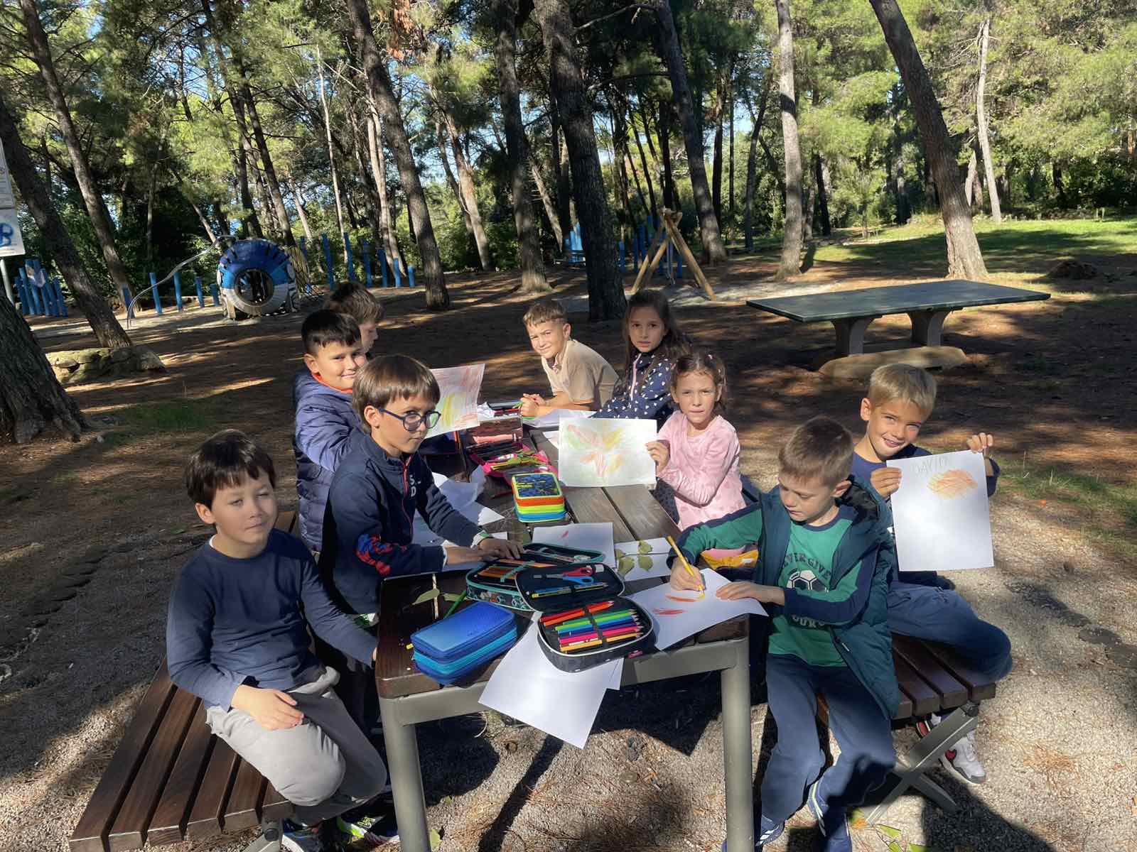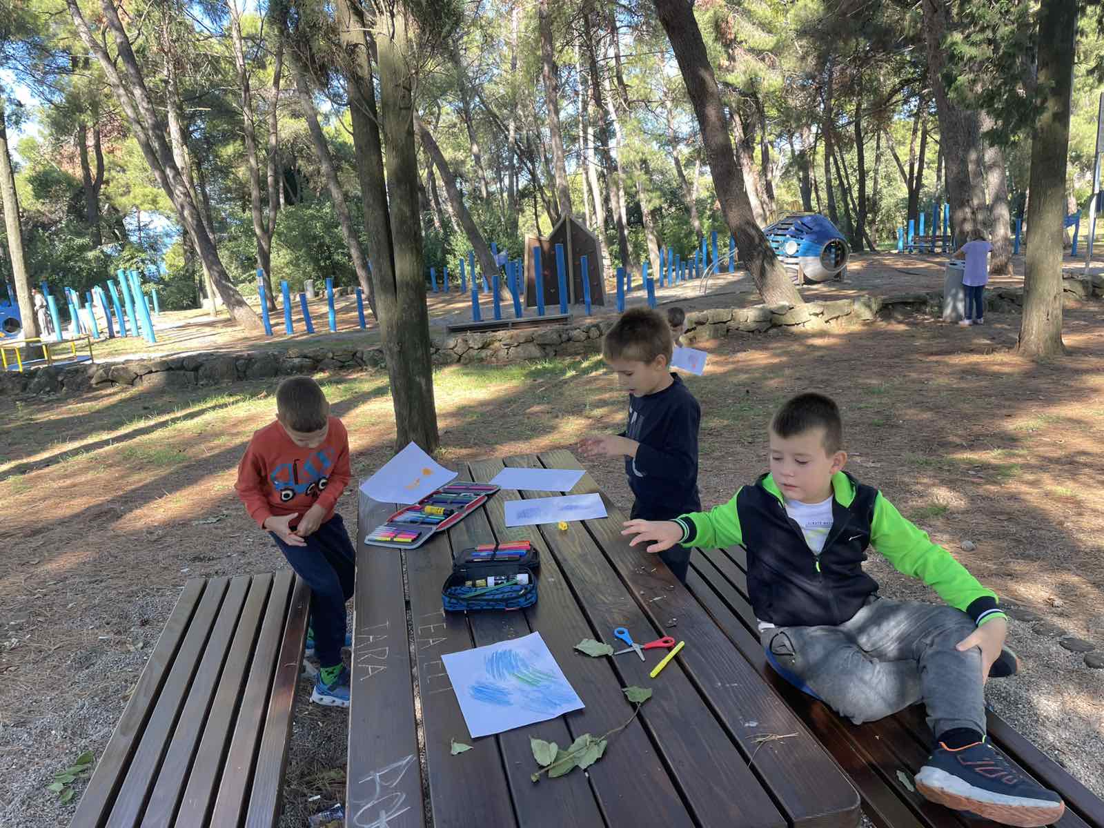 Sunčani jesenski dan učenici 1.A razreda proveli su u učionici na otvorenom, okruženi toplim bojama jeseni i svježim zrakom. Tijekom boravka u prirodi promatrali su promjene koje jesen donosi – opadanje lišća, zrele plodove i bogatstvo boja u krošnjama drveća. Učenici su s velikim zanimanjem razgovarali o onome što su uočili te su naučili prepoznati razne znakove promjene godišnjeg doba. Inspirirani viđenim, likovno su se izražavali koristeći jesenske motive i boje, stvarajući vesele radove pune mašte. Ovakva nastava u prirodi potaknula je njihovu radoznalost, kreativnost i ljubav prema okolišu, a ujedno im pružila i ugodan dan u druženju i učenju na svježem zraku.